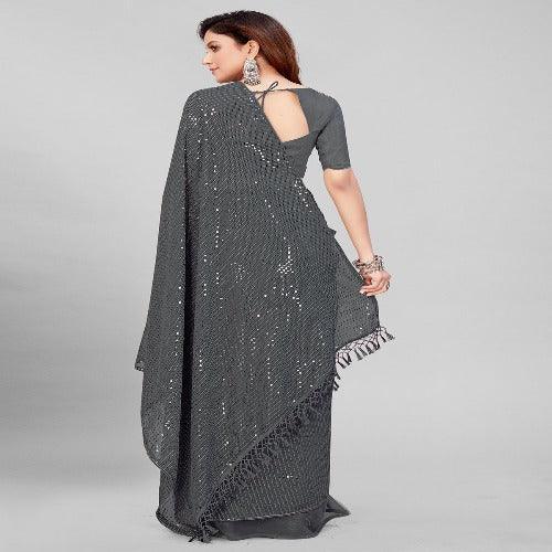 Fancy Sequined Embroidered Grey Coloured Georgette Saree with Blouse Piece