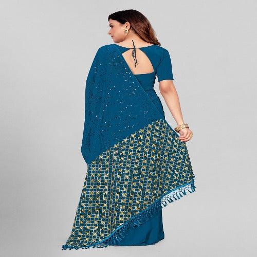 Fancy Sequined Embroidered Teal Blue Coloured Georgette Saree with Blouse Piece
