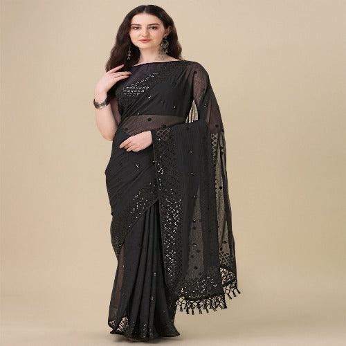 Fancy Sequined Embroidered Black Coloured Georgette Saree with Blouse Piece