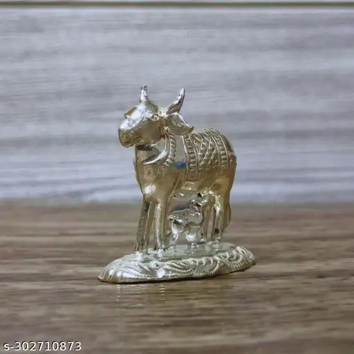 German Silver Kamadhenu Cow And Calf Idol For Pooja / Decor Height : 1.5 Inches Weight : 11 Grams