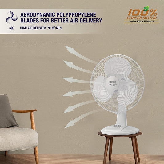 USHA Maxx Air Ultra Table Fan | 400MM Sweep Size | 1350 RPM | Aerodynamic Blade Design for High Air Delivery | Corrosion Protection with Plastic Blades | 3 Speed Settings | 100% Copper Motor | 2 Year Warranty | White