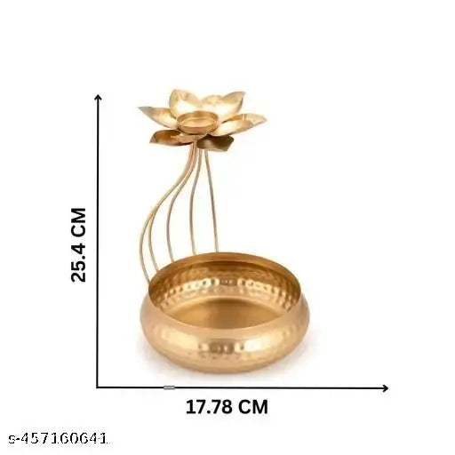 Metal Tealight Candle Holder for Diwali Decoration Items with Base of Urli Bowl - Gold (Height 10 Inch),