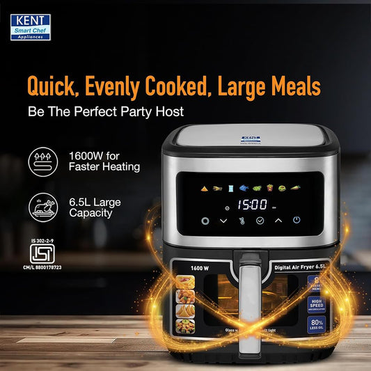 KENT Digital Air Fryer 6.5L,1600W,Bake,Grill & Roast,Up To 80% Less Oil Usage,Rapid Heat Circulation,8 Preset Menu,Digital Display & Touch Control Panel,Glass Window With In Built Light,Black