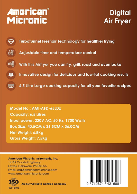 AMERICAN MICRONIC® 6.5 L Digital Air Fryer | 1700W Rapid Air Technology | 200°C Max Temp | 60-Min Timer | 8 Preset Menus | Removable Basket | Includes Recipe Book | AMI-AFD-65LDx (Black & Steel)