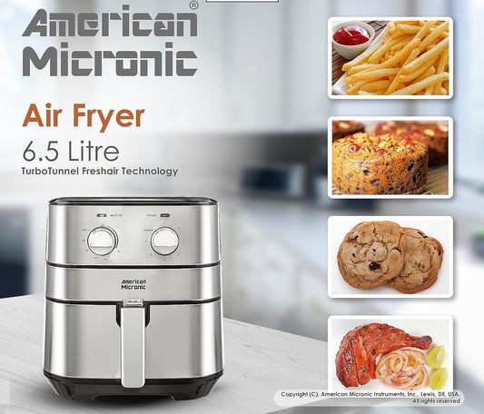 AMERICAN MICRONIC® 6.5 L Air Fryer for Home | 1700W Rapid Air Technology | Removable Basket | 60-Min Timer | Fry, Grill, Roast & Bake | Free Recipe Book | AMI-AFM-65LDx (Black & Steel)