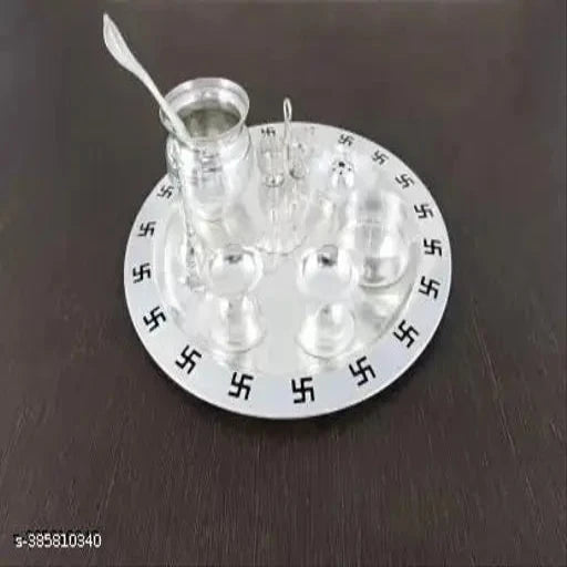 9 Inch Swastik Pooja Thali With Free Chandan, Silver Plated (9 Pieces, Silver)