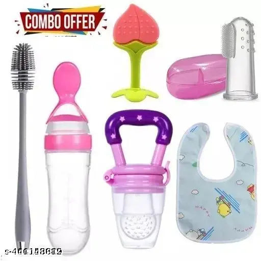 New Baby Combo Silicone BPA Free Teether, Fruit Nibbler, Spoon Bottle, Bib, Finger Brush , Bottle Cleaning Brush (combo of 6)
