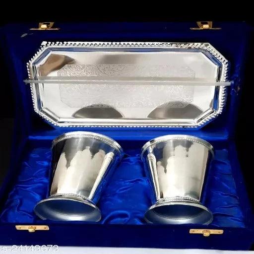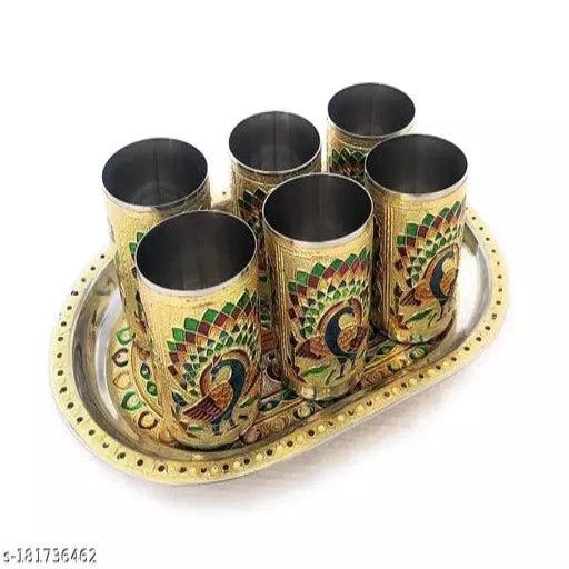 Handicrafts Golden Meenakari Glass Tray Set Stainless Steel Tray Glasses , Peacock Designed Handcrafted Steel Tray