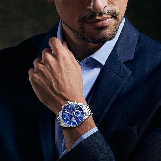 Pranshi Nano Glass for OLEVS chronograph Men's Stainless Steel Watch (Blue Dial Silver Colored Strap) - Copy (Pack of 1)