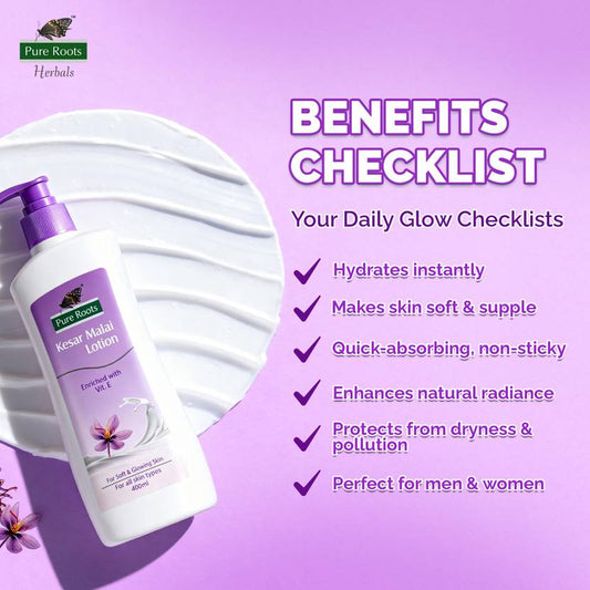 Pure Roots Kesar Malai Body Lotion 400ml (Pack of 2) | Nourishing & Fast Absorbing (800 ml)