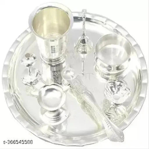 7 Inch Traditional Pooja Thali Set Silver Plated (7 Pieces, German Silver) Diwali Gift