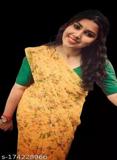 AnyTime's Printed Yellow Georgette Chiffon Saree With Blouse Piece