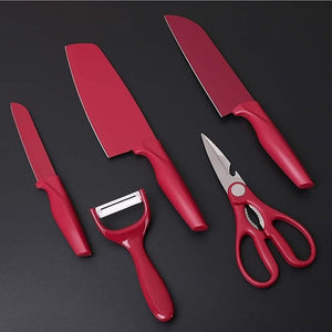 5-Piece Premium Red Kitchen Knife Set with Scissors and Peeler – Non-Stick Stainless Steel Blades and Ergonomic Handles for Home & Professional Use