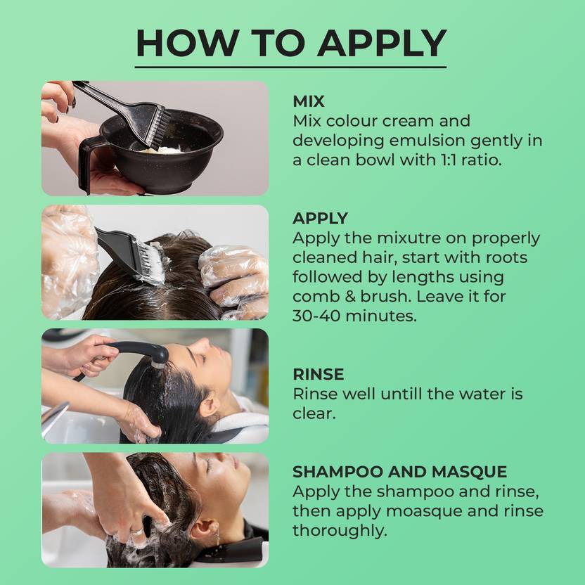 This advanced system ensures optimal color penetration while being exceptionally gentle on your hair and scalp.What's Inside Colouring Cream Tube (60 ml)Developing Emulsion Bottle (60 ml)Nourishing Masque Sachet Gentle Shampoo Sachet Application Brush User Manual Disposable Gloves, A Safe and Nourishing Formula More than just a hair color, our formula is free of Ammonia, PPD, and Resorcinol.