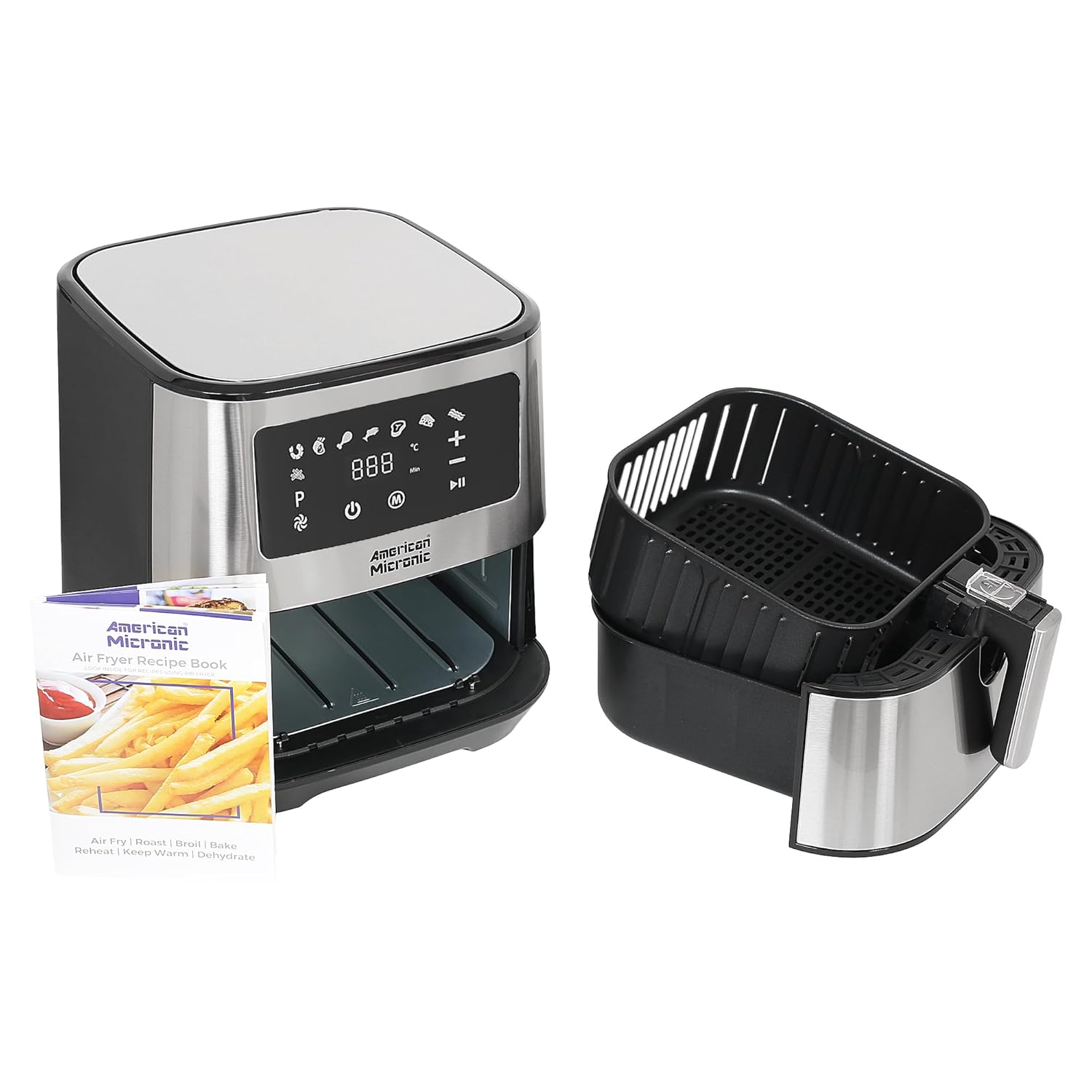 AMERICAN MICRONIC® 6.5 L Digital Air Fryer | 1700W Rapid Air Technology | 200°C Max Temp | 60-Min Timer | 8 Preset Menus | Removable Basket | Includes Recipe Book | AMI-AFD-65LDx (Black & Steel)
