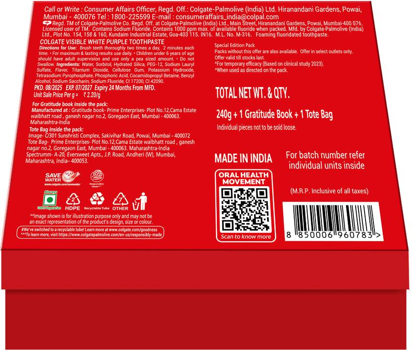 Colgate Visible White Purple Toothpaste Signed Gratitude Journal & Tote Bag Toothpaste (240 g)