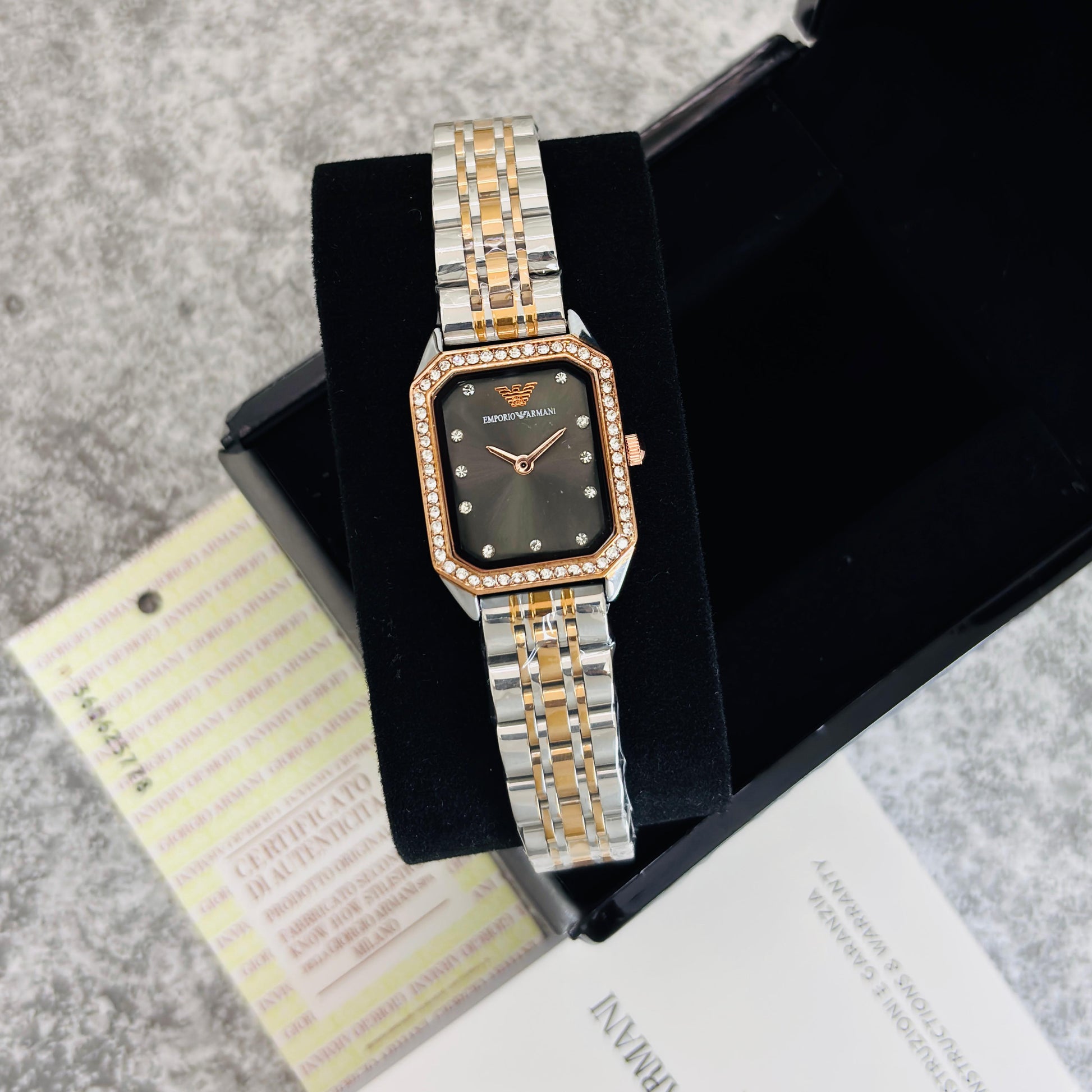 Features: Powered by original Quartz machinery, Stainless-steel Rosegold, Rose two-tone polished round case with a Rosegold bezel with minute markings and Rosegold band Emporio Armani ROSA Strap mineral crystal glass on MOP dial fastened by a push-button deployment clasp installed with Orginial butterfly pushing lock system