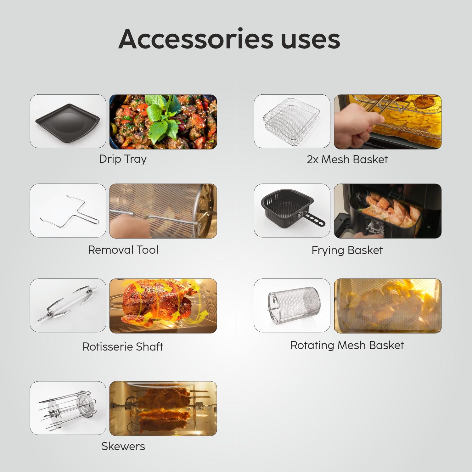- Comes with everything you need for multi-functional cooking, including a drip tray, removal tool, rotating mesh basket, skewers, rotisserie shaft & 2x mesh baskets.