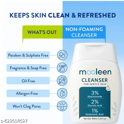Product Name Mooleen Gentle Exfoliating Face Wash Cleanser | 3% Niacinamide + Glycolic & Hyaluronic Acid | Brightening, Unclogs Pores, Hydrates Skin | For Men & Women.