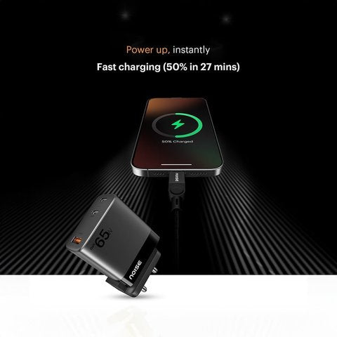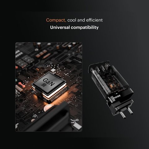 The Noise Power Series GaN charger delivers a powerful 65W output in a compact, black design. Utilizing advanced Gallium Nitride technology, it offers faster and more efficient charging while maintaining a small, portable form factor. Ideal for charging laptops, smartphones, and other USB-C devices, this charger ensures reliable power delivery with optimal heat management and energy efficiency. Perfect for professionals seeking robust performance and convenience in one sleek package.