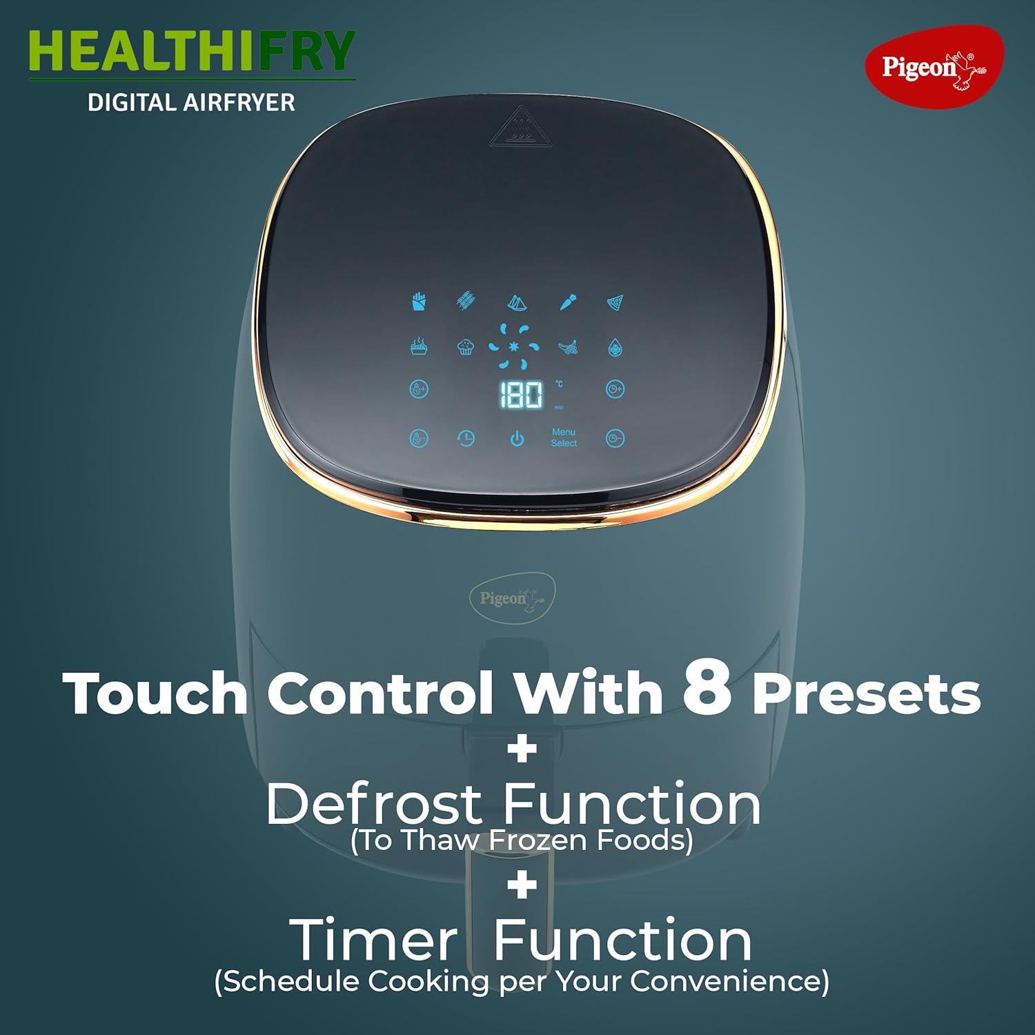 - HEALTHIER FRIED FOOD: Pigeon Healthifry Digital Air Fryer is a tool that is used to cook food with 85% less oil which means with only one spoon of oil, you can cook your favorite food items. 360° HIGH SPEED AIR CIRCULARION TECHNOLOGY: Air fryers work by circulating hot air around a food item to create the same crispiness as traditional fried foods.