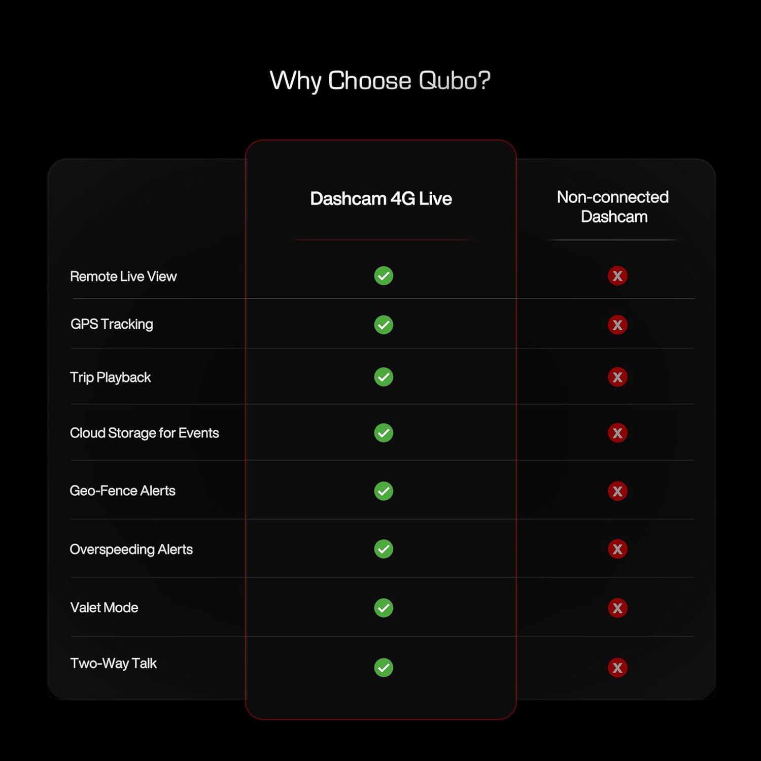 - 【Qubo Pro App】 Control your dashcam remotely — live feed, downloads, trip data, alerts, settings, everything in one seamless app.