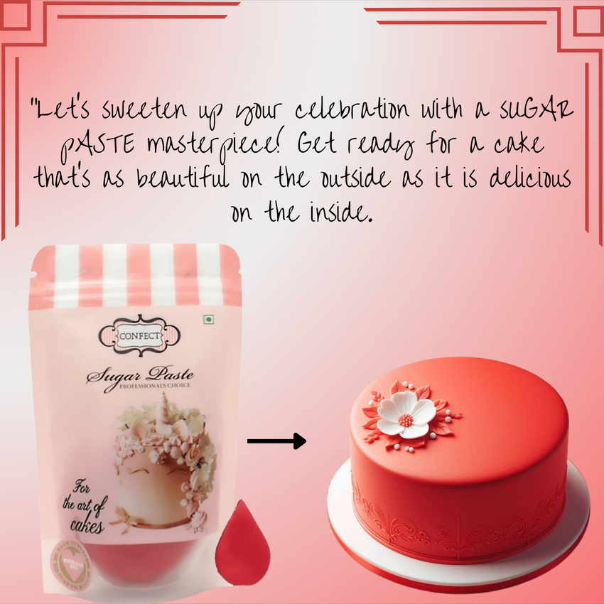 Confect Sugar Paste Smooth, Versatile & Perfect for Cake DecorationConfect Sugar Paste is a premium-quality, pliable fondant available in a variety of colors, perfect for cake decorating. Whether covering cakes or crafting intricate details, it rolls smoothly, shapes beautifully, and resists cracks or drying. Ideal for weddings, birthdays, and special occasions, it ensures a flawless, professional finish.Features Vibrant & Elegant Colors Available in multiple shades for creative cake designs. Smooth & Pliable Rolls out effortlessly for seamless coverage and decorations. Versatile Use Perfect for sculpting flowers, ribbons, and fine detailing. Even & Consistent Finish Ensures a sleek, polished look. Long-Lasting Workability Stays flexible for precise decorating. 100% Edible & Safe Made from high-quality, food-grade ingredients.Shelf Life & Storage Best Before 16 months from manufacturing. Storage Keep in a cool, dry place, away from direct sunlight. Seal Properly Store airtight to maintain freshness and prevent drying.Usage Tips Knead before use for a smooth texture. Dust surface with cornstarch to prevent sticking. Allow cakes to set after decoration for best results.Confect Sugar Paste Smooth, Versatile & Perfect for Cake Decoration Confect Sugar Paste is a premium-quality, pliable fondant available in a variety of colors, perfect for cake decorating. Whether covering cakes or crafting intricate details, it rolls smoothly, shapes beautifully, and resists cracks or drying. IdConfect Sugar Paste Smooth, Versatile & Perfect for Cake Decoration Confect Sugar Paste is a premium-quality, pliable fondant available in a variety of colors, perfect for cake decorating. Whether covering cakes or crafting intricate details, it rolls smoothly, shapes beautifully, and resists cracks or drying. Id