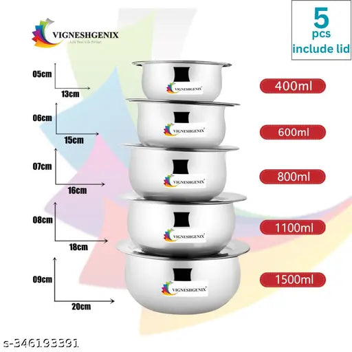 The VIGNESHGENIX 5-Piece Stainless Steel Kitchen Serving & Cooking Handi with Lid is a versatile cookware set designed to make meal preparation and storage easier. Heres a detailed description